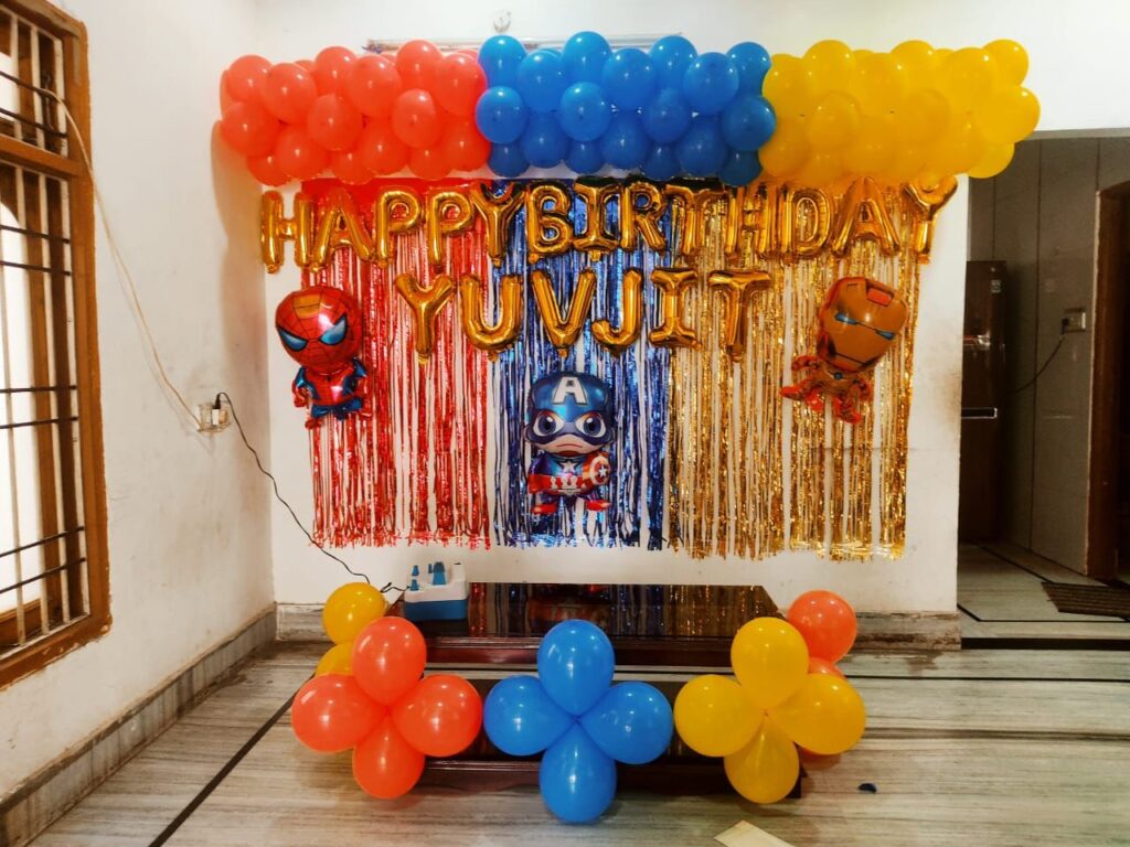 Theme-based decoration is one of the most searched birthday decoration ideas at home for balloon decoration in raipur, especially for kids’ birthdays.